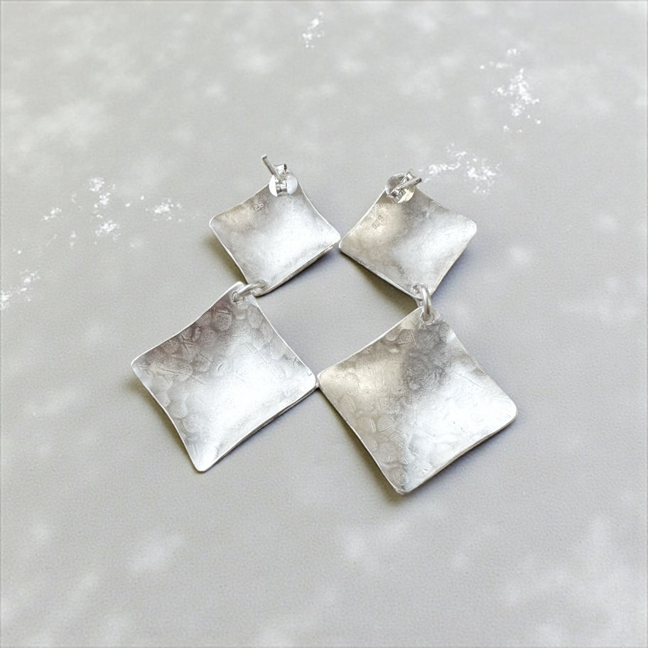 Sculptural and bold, these earrings feature two softly rounded cushion forms connected in a dynamic drop. The hammered silver surface catches the light with a raw, artisanal shimmer, balancing texture with clean geometry.